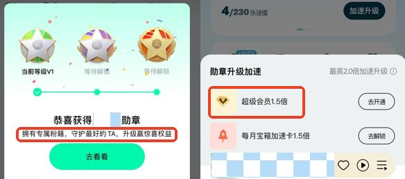 经典的乐迷值排行榜,经典的勋章,配套上经典的超级会员 1.5 倍加速勋章升级。