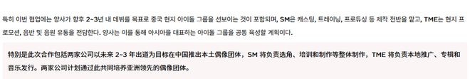 前阵子 SM 娱乐就官宣,未来 2~3 年内,计划双方一起推出一支中国本地化的偶像组合 ↓ ↓