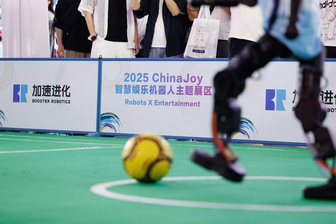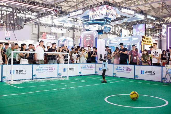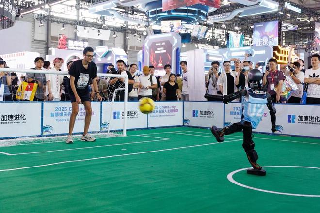 智慧娱乐机器人主题展区划分为“展览展示+赛事活动”两大功能区域,集展示、互动、竞技于一体,并邀请了智元科技、优必选、加速进化等知名机器人参展。加速进化(Booster Robotics)将两台在2025RoboCup巴西机器人足球世界杯中夺得冠亚军的机器人带上了展台,并邀请观众上台和机器人进行点球大战。经过一系列的计算和姿态调整,机器人稳稳当当地开出了颇有力道的一球,虽然未能进球,但是依旧获得了观众的喝彩。