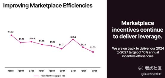 重要的是,Lyft 在保持稳定市场份额的同时,还降低了每趟行程的激励支出(包括向乘客提供的折扣以及向司机支付的收益激励,这些激励旨在平衡市场供需以提高出行量)。此外,过去几年激励支出一直呈大幅下降趋势。下图显示,第二季度 Lyft 每趟行程的激励支出为 1.03 美元,同比下降 20%。这一改善幅度优于第一季度 10% 的同比降幅,也远高于公司(到 2027 财年)三年内将激励支出每年减少 10% 的目标。
