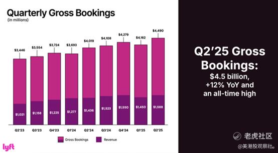 另一个值得注意的点是:Lyft 对第三季度的业绩指引预计总预订量为 46.5 亿至 48 亿美元,同比增长 13% 至 17%。这表明相比 2025 年上半年的业绩将进一步加速,意味着 Lyft 预计在宏观经济相对不稳定的情况下仍能取得相当不错的业绩。这一增长加速部分得益于公司对德国 Freenow 的收购,这是其首次重大的国际拓展(该交易于 7 月 31 日完成,将在第三季度贡献两个月的收益)。