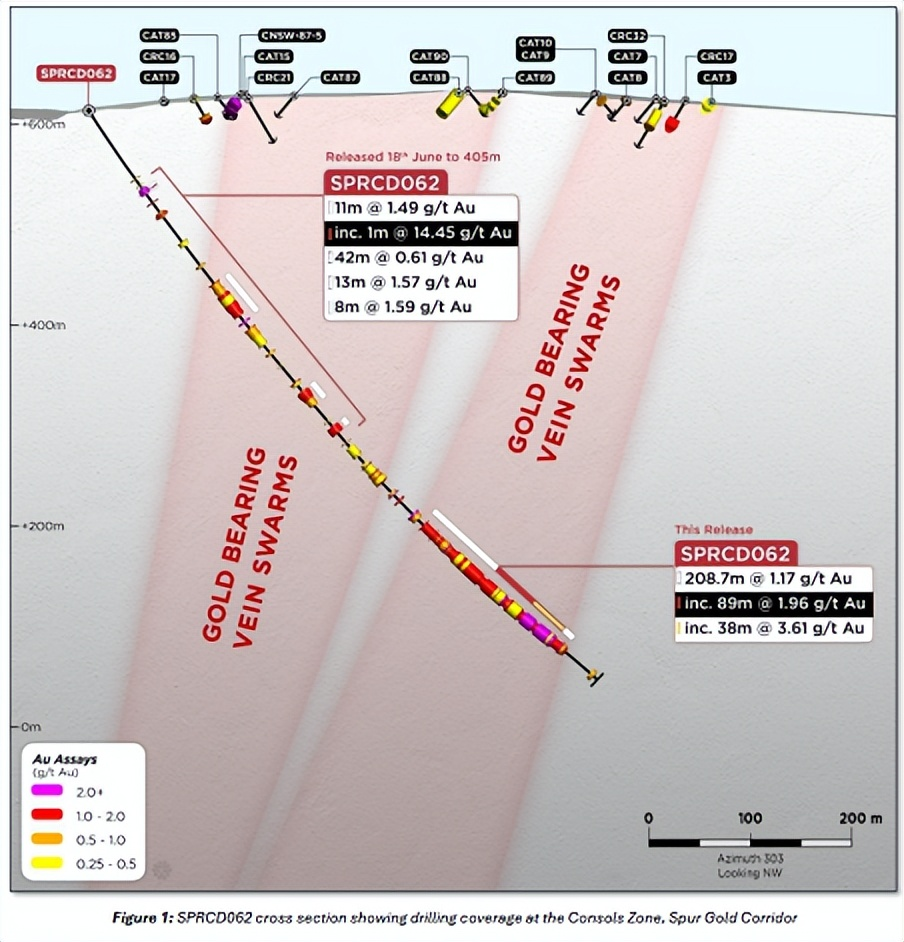 SPRCD062将Spur黄金走廊沿走向进一步延伸500米,使其总长度超过1.5公里,已知金矿范围得到显著扩展。