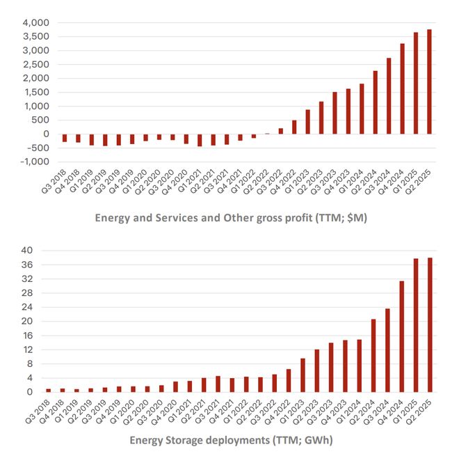 在汽车业务光芒黯淡的同时,能源业务的表现异常稳健。储能产品(Megapack和Powerwall)的部署量,在TTM(过去十二个月)维度上,已连续第12个季度创下历史新高 。其业务毛利贡献也在显著增长 。