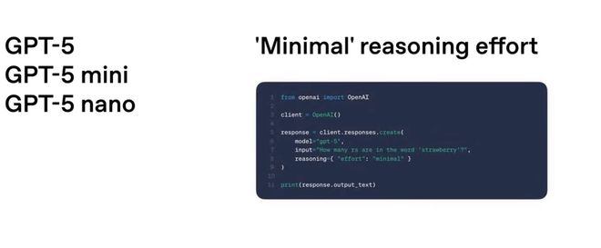 此外,OpenAI 还在 API 中发布了一个名为“Minimal”的新参数,这样你就可以在所有用例中使用 GPT-5,只需改变推理的力度。