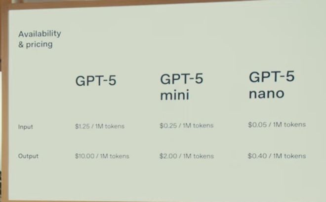 此外 Token 定价部分,标准版 GPT-5 为每百万输入 Token 1.25 美元,每百万输出 Token 10 美元。mini 版 与 Nano 版定价都便宜不少。