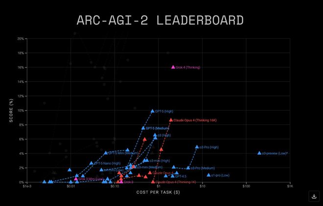 GPT-5 也在新的 ARC-AGI-2 上进行了测试。除 Grok 4(思考)外,它的表现优于所有主要模型。