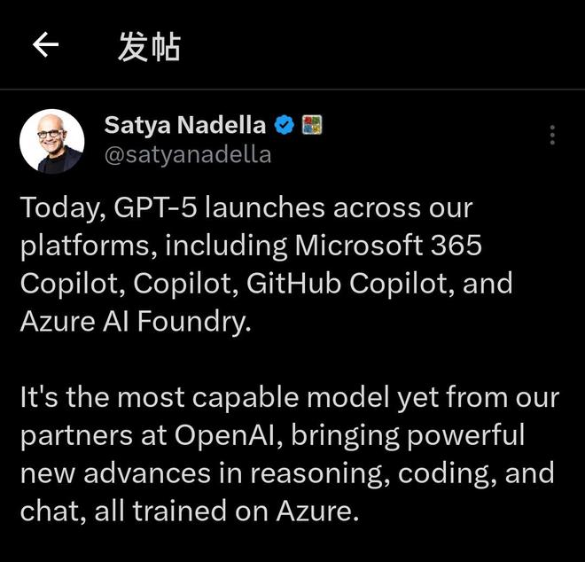 除了 OpenAI 的第一方平台,微软 CEO 纳德拉同时也宣布,GPT-5 已在微软全系平台上线,包括 Microsoft 365 Copilot、Copilot、GitHub Copilot 和 Azure AI Foundry。同时所有这些改进均在 Azure 上进行训练。