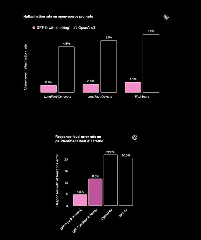 “AI 幻觉”一直是大家吐槽的重灾区。好消息是,GPT-5 在这方面下了大功夫,官方宣称其产生幻觉的可能性“显著降低”。具体来说: