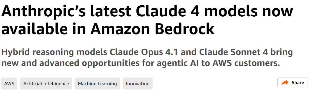 与此同时,对于 Anthropic 的最新最强模型 Claude Opus 4.1,亚马逊云科技也第一时间宣布上线 Amazon Bedrock,进一步加深双方在前沿大模型技术上的战略协同。