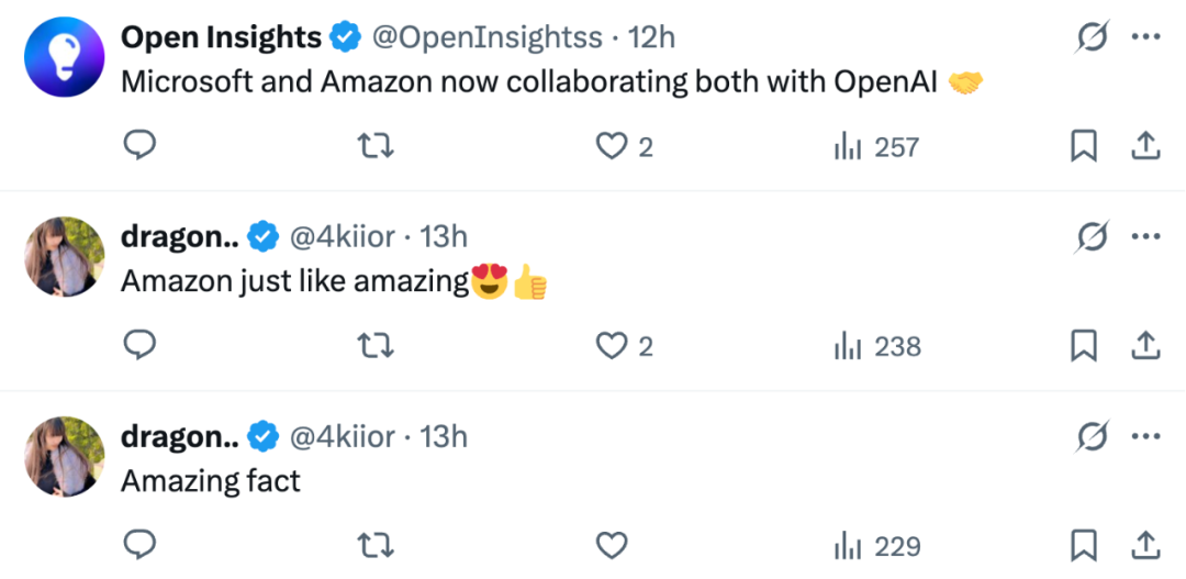 对于亚马逊云科技与 OpenAI 的合作,评论区的网友不淡定了,直呼“不可思议”。这标志着,微软将不再是唯一一家可以转售 OpenAI 软件和服务的云服务商,其一家独大的地位如今被亚马逊云科技打破了,真可谓是 AI 行业的一件大事。