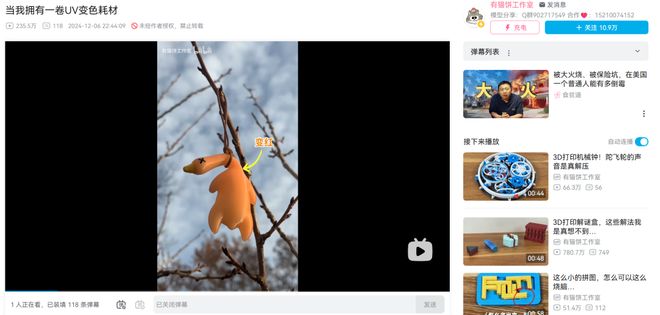 有一位叫做“有猫饼工作室”的UP主,总会用3D打印做一些稀奇古怪的小玩意。2024年10月份,这位UP主使用一种可以变色的3D打印线材,打印出了这只“烤鸭”。