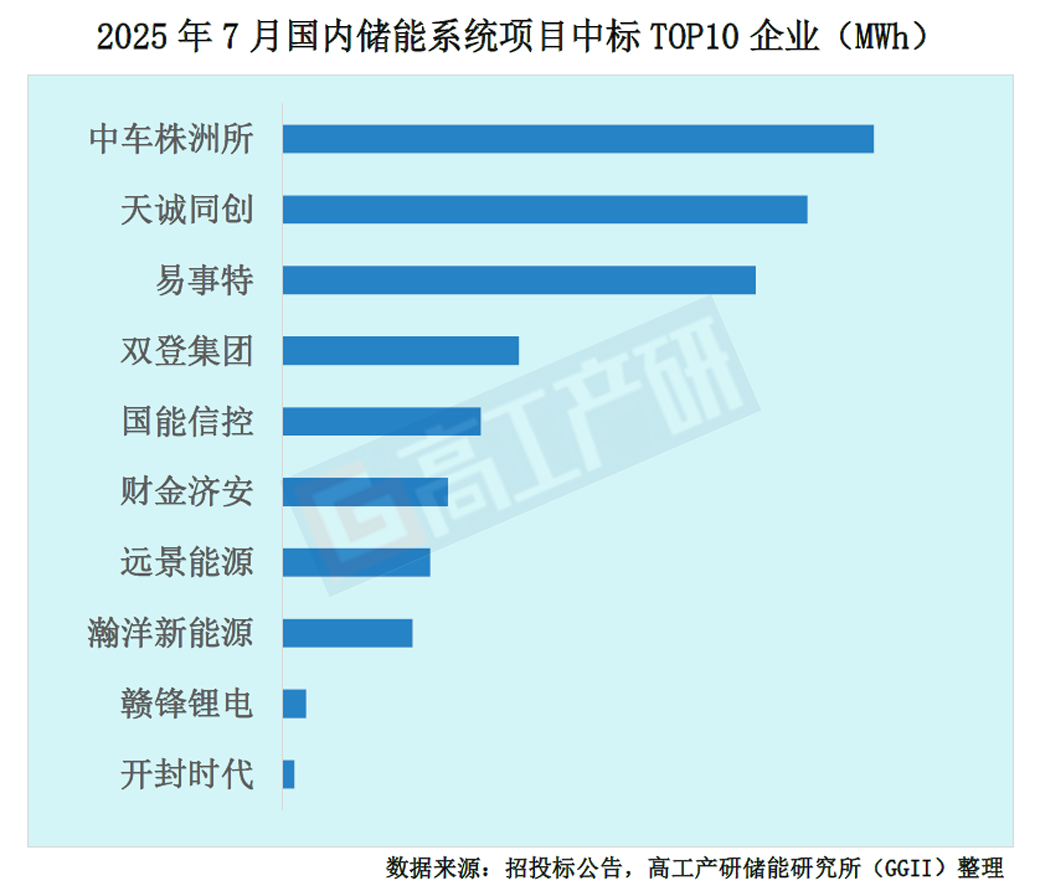 从储能系统项目开标来看,7月中标规模4.23GWh。其中,中车株洲所中标达1GWh,占比24%,位居本月储能系统中标规模榜首。