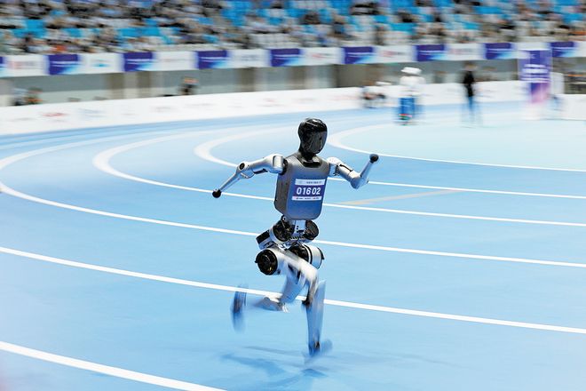 首届世界人形机器人运动会1500米决赛现场 (IC photo)