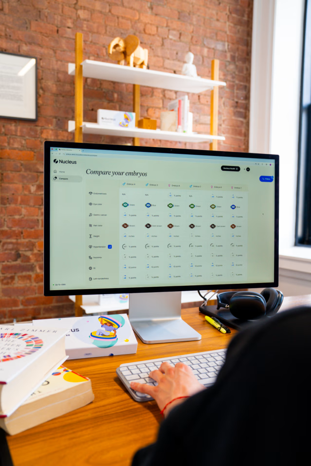 电脑屏幕显示 Nucleus Genomics 的胚胎分析软件,对几个胚胎进行比较。