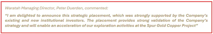 Waratah董事总经理Peter Duerden表示,此次战略配售得到公司现有和新机构投资者的大力支持,旨在加速推进Spur金铜矿项目的勘探活动。