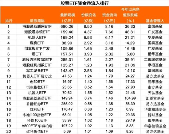 Wind统计显示,资金净流入前20大股票ETF中,港股相关ETF继续“霸屏”,上榜7只,主要涉及互联网、非银、科技、红利、创新药、证券方向;行业主题方面,机器人、红利主题相关ETF各占3只。