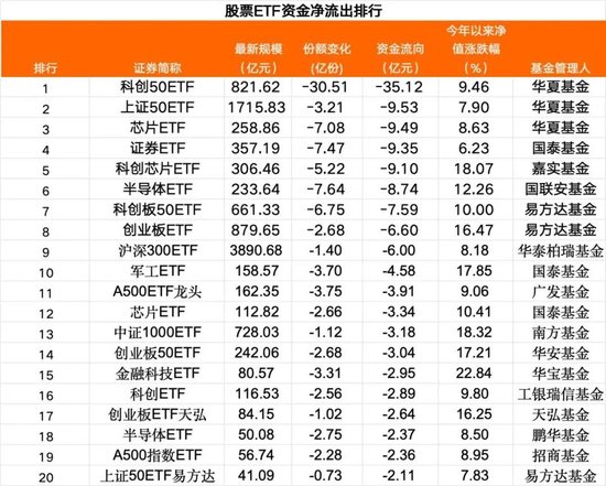 Wind数据显示,8月14日,净流出前20大股票ETF中,科创板ETF有3只,合计资金净流出超45亿元;创业板ETF有3只,合计净流出超12.5亿元;上证50ETF有2只,合计净流出近12亿元。行业ETF方面,芯片半导体相关ETF有5只,合计净流出超32亿元;证券、军工等相关ETF净流出也较多。