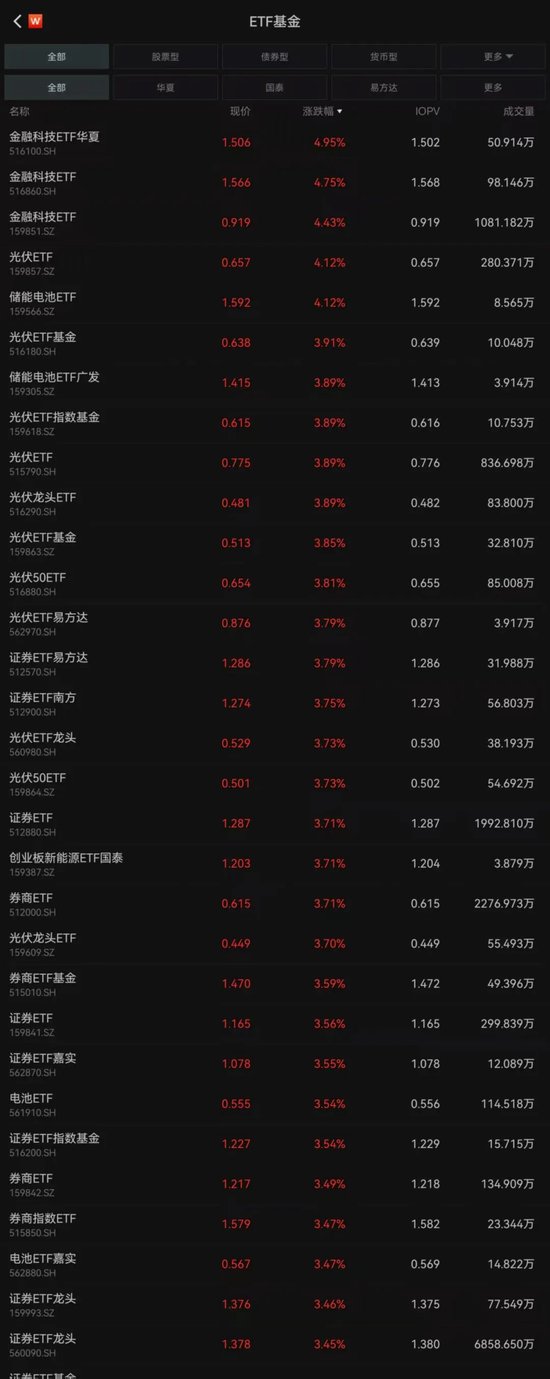 二级市场上,8月15日上午时段,股票ETF整体表现活跃,近50只涨幅超3%,金融科技、光伏、储能电池、证券等行业主题ETF领涨,银行相关ETF领跌。从成交额来看,香港证券ETF、港股创新药ETF半日成交额分别超165亿元和62亿元。