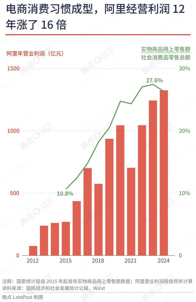 2003 年淘宝上线后,阿里曾允诺 5 年不向商家收费。它确实做到了,迅速击败易趣、甩开京东和腾讯,在后来十多年里彻底转变了人们的消费习惯——现在全国 27% 的实物消费发生在线上,而阿里经营利润也在最近一个财年涨到了超过 1400 亿元。