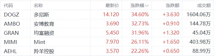 格隆汇8月15日|中概股收盘涨幅前五的个股为:多尼斯涨34.6%,安博教育涨32.73%,均富融资涨31.96%,Mint涨26.11%,羚羊控股涨22.26%。(格隆汇)