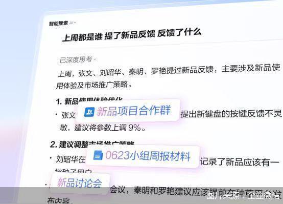 智能总结面对的是管理痛点,可以自动整合群聊、文档、会议记录,生成项目进展报告,一个细节是,智能总结功能无需用户额外手动整理资料,AI会自动基于自然工作流提炼客观结论,让总结汇报更加客观真实。