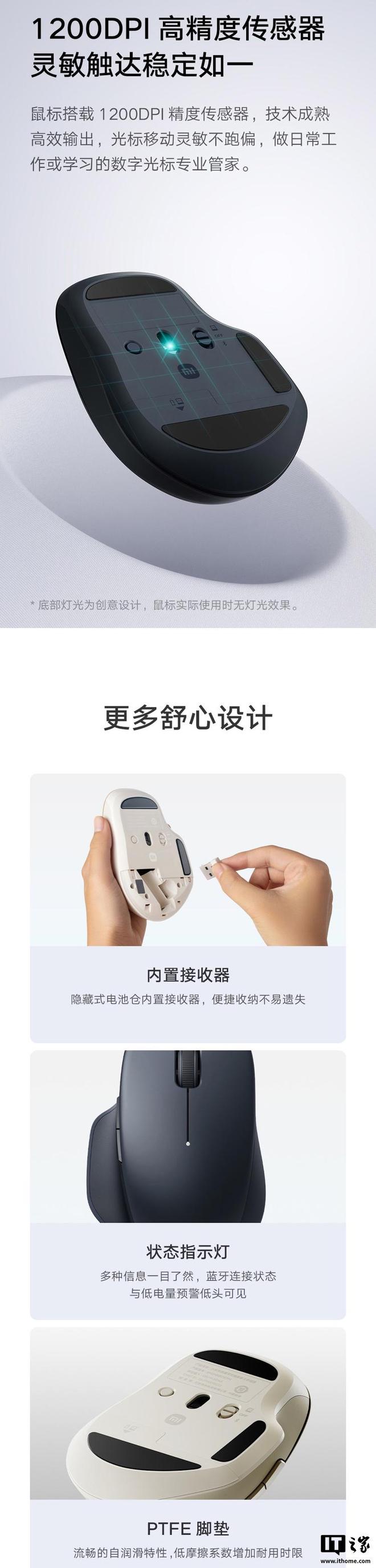 此外,该鼠标配备全新设计 TTC 轻音开关,优化内部结构,吸收击键噪音。搭载 1200DPI 精度传感器,支持 2.4GHz + 蓝牙双模连接,可实现 2 台连接设备间任意切换。鼠标提供隐藏式电池仓,内置接收器,配备状态指示灯、PTFE 脚垫。