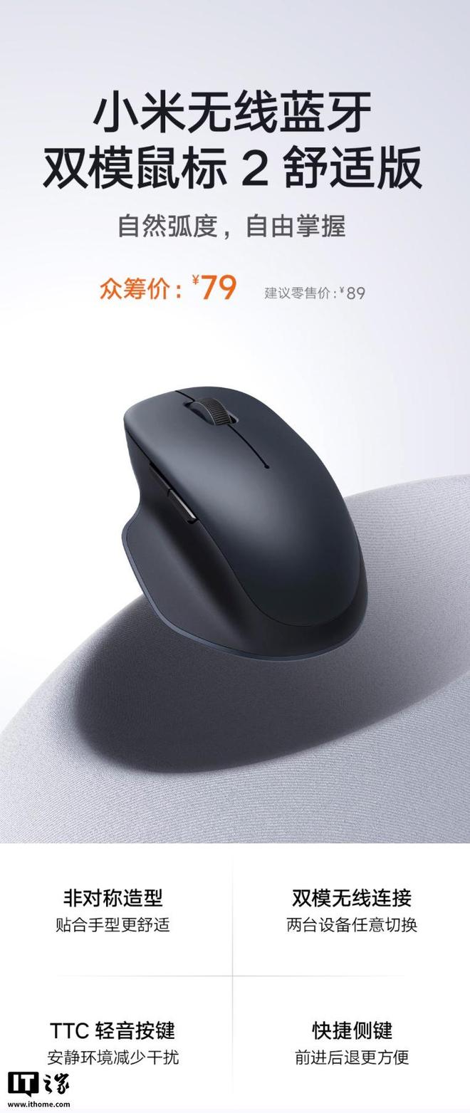 IT 之家 8 月 20 日消息,小米无线蓝牙双模鼠标 2 舒适版现已在小米有品上架,将于 8 月 27 日上午 10 点开启众筹,该鼠标标准价 89 元,众筹价 79 元,商品页(点此访问)。