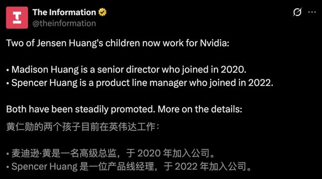 2020年以来,黄仁勋的两个儿女Madison和Spencer,相继入职英伟达:
