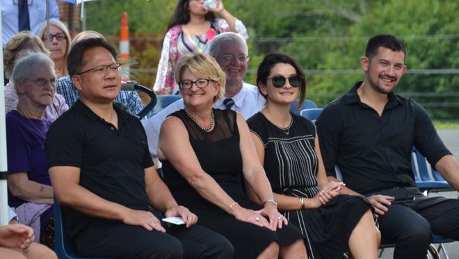 英伟达创始人兼CEO黄仁勋(中),与儿子SpencerHuang(左)女儿Madison Huang(右)