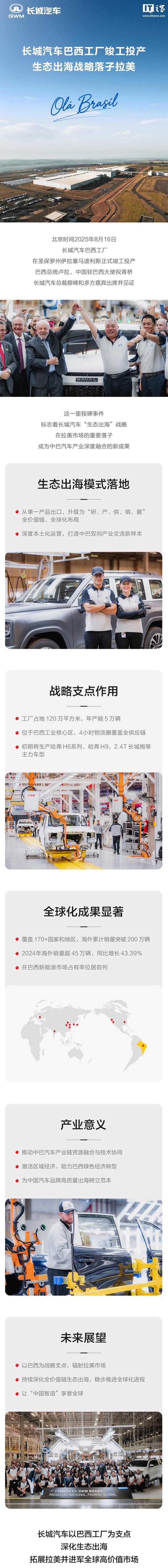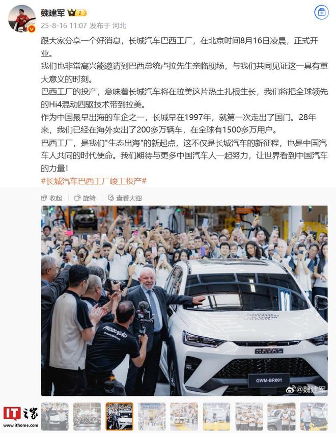 据IT之家昨日报道,长城汽车董事长魏建军上午在微博宣布,长城汽车巴西工厂于北京时间 8 月 16 日凌晨正式开业,巴西总统卢拉也亲临现场。魏建军表示,将会把 Hi4 混动四驱技术带到拉美。另外,长城汽车 1997 年首次走出国门,28 年来已在海外卖出 200 多万辆车,全球范围内拥有超过 1500 万用户。