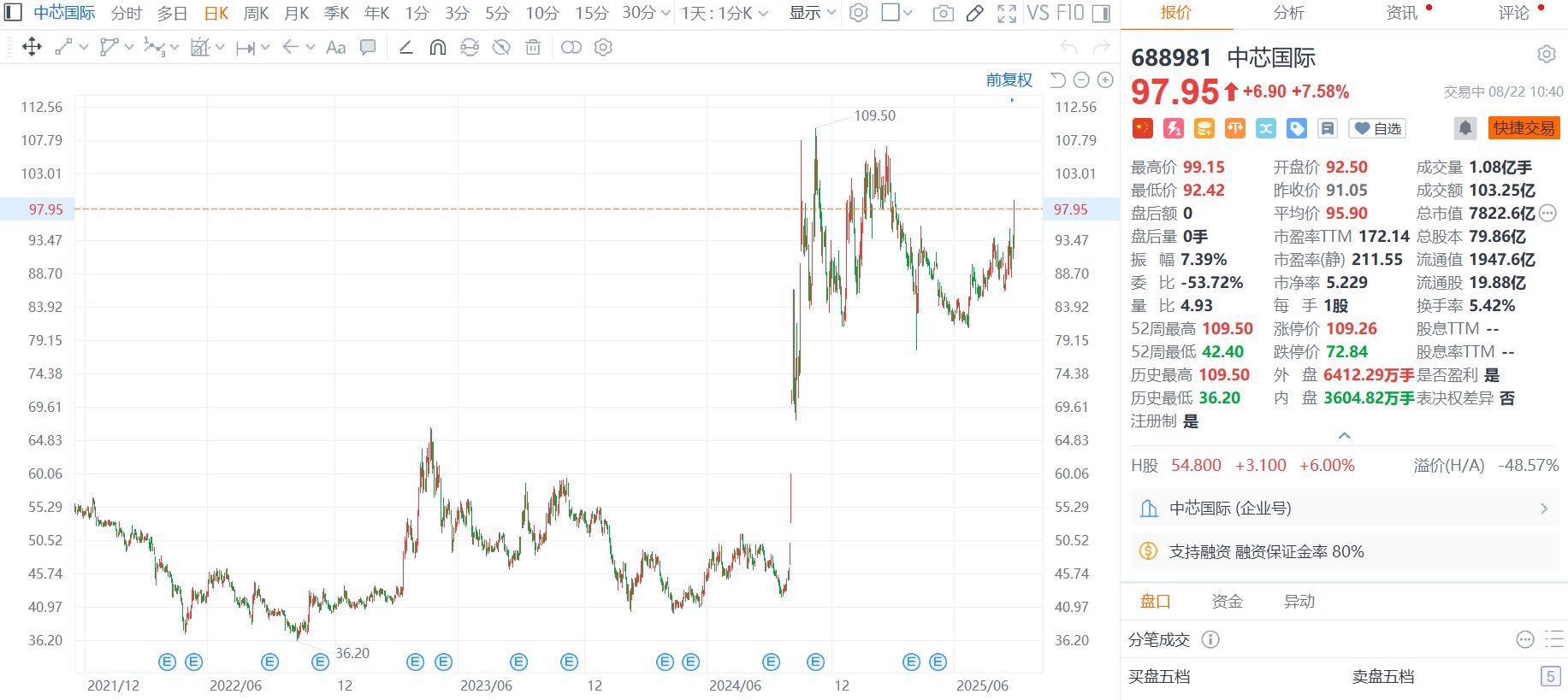 格隆汇8月22日|中芯国际A股涨7.58%,成交额超100亿元。