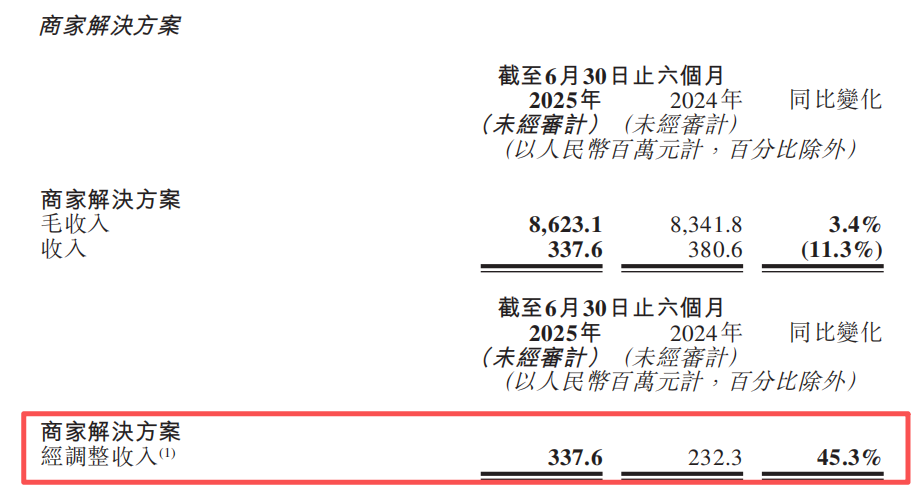 虽然主动调整客户结构使得广告投放毛收入增长端有所放缓,但这有效提升了商家解决方案服务的盈利水平,确保了财务健康,这在两个层面有所体现,其一是商家解决方案的经调整收入大增45.3%至3.38亿元,该业务成为带动微盟经调整总收入增长的核心推动力。