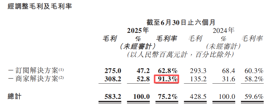 其二,报告期内的商家解决方案的经调整毛利率高达91.3%,较2024年同期提升33个百分点,这带动微盟的总毛利率升至75.2%,提升超15个百分点,对应的总毛利增长36.1%至5.83亿元。显然,主动调整商家解决方案服务的客户结构对于改善该业务的盈利水平有关键性作用。