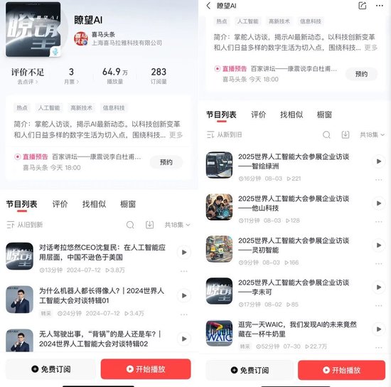 在播客领域,喜马拉雅也曾推出很多独创内容。以WAIC即世界人工智能大会为例,喜马拉雅2024年就与大会合作,在现场搭建播客空间,将现场采访内容录制成播客汇聚到喜马拉雅的节目《瞭望AI》中;2025年喜马拉雅更是大会独家播客合作平台,访谈了李未可、灵初智能、他山科技等科技企业代表,相关内容同样收录至《瞭望AI》。
