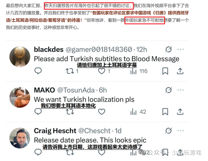 网易新推出的《归唐》受到广泛关注,不少外国网友希望提供西班牙语/土耳其语/阿拉伯语/葡萄牙语等语种字幕。