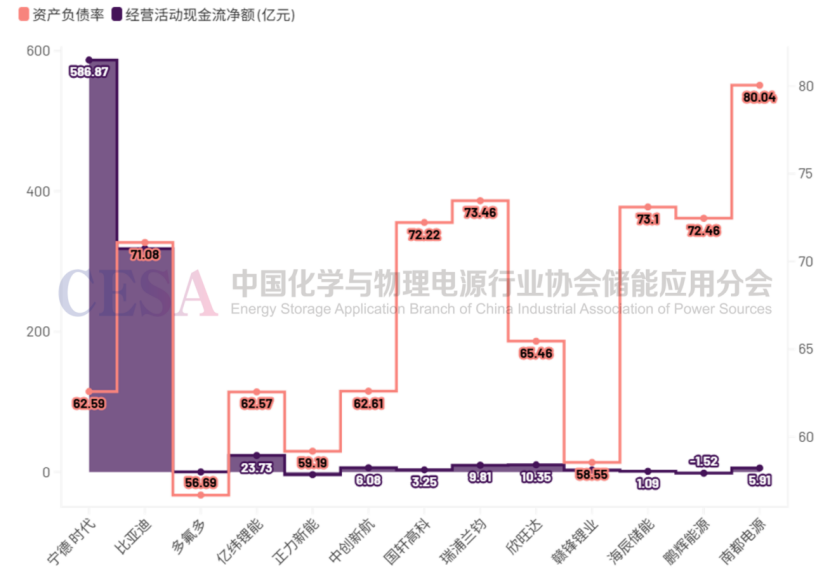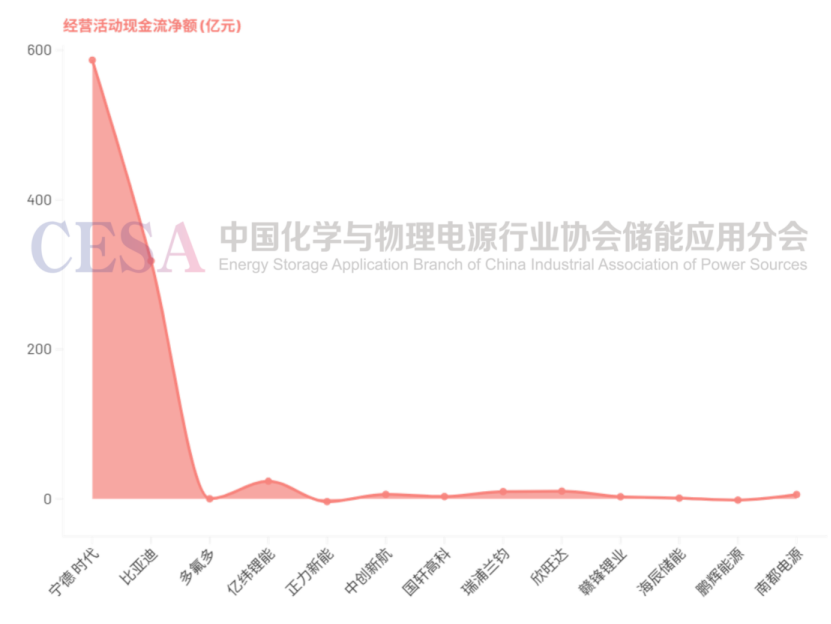 行业的“内生造血能力”正呈现出严重的马太效应和两极分化。具体来看,头部双寡头——宁德时代与比亚迪,合计贡献了超过900亿的经营现金流,展现出强大的财务韧性;相比之下,赛道内的其余12家企业经营现金流总额仅为58.35亿元,几乎不在同一个量级上。