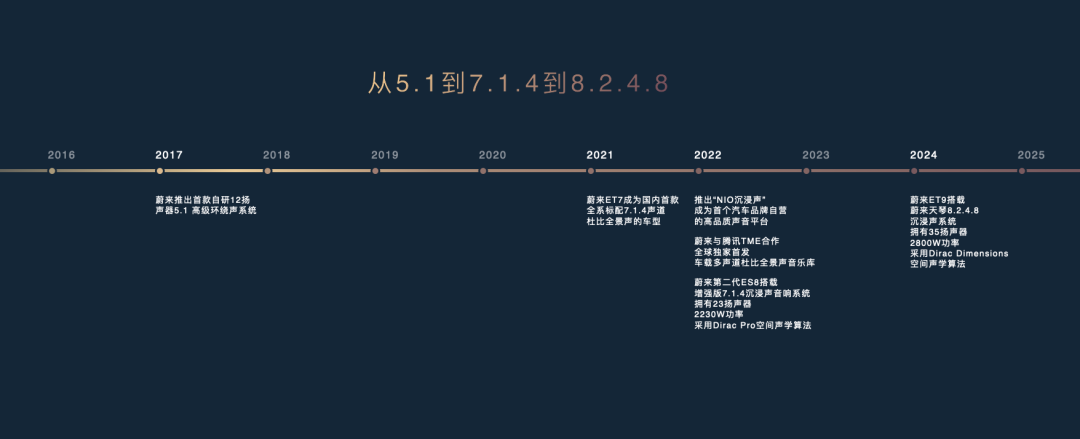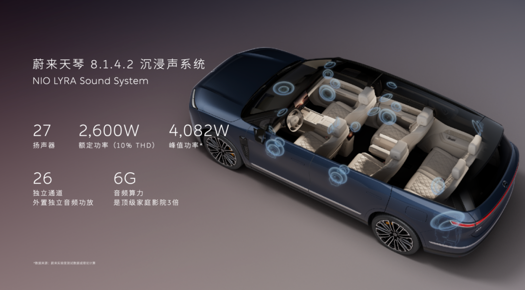 蔚来在音响技术与体验方面的自研创新由来已久,从2017年第一代ES8上市,基于自研打通了软硬件链路,行业首创推出5.1环绕音响系统;在2022年蔚来第二代平台首款车型ET7上,为了将沉浸式影院级的声音体验带到座舱,与杜比进行了深入的沟通、Demo验证,同时与声学校准技术最好的公司Dirac针对座舱空间共研、校准、适配,在自研音响系统上实现了行业首款支持7.1.4杜比全景声音响的量产,随后也在蔚来之后的车型上全系标配7.1.4;在ET9九霄天琴8.2.4.8沉浸声音响系统上,蔚来与Dirac共研打磨出实车体验最好的超境环绕效果,得益于自研音响系统打通了4个头枕音响参与调试,让每个座位都实现了完整的独立环绕音区,大大提升了听音的体验感。