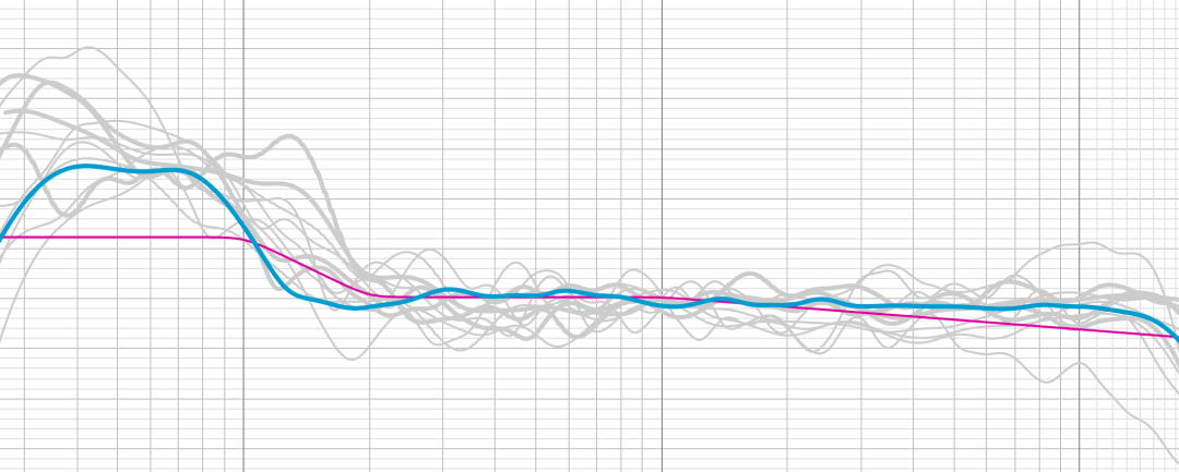 灰色曲线:其它对标车型曲线(总体音染较多,尤其低频过量严重)