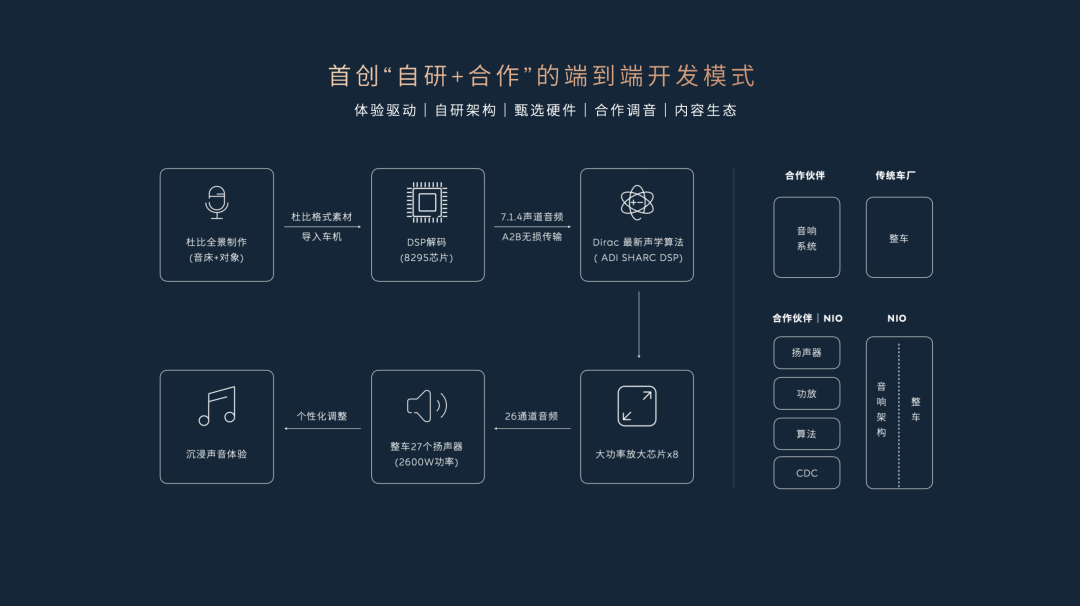 坚持自研是重塑“中国声”话语权的必要条件。汽车音响行业大多数会选用第三方打包好的“公版预制菜”音响方案,好处是省去费时费力的研发周期,但同时也失去了对声音体验的掌控权。蔚来却选择了一条更具挑战,也更具创新、更能贴近用户需求的道路:以自研为核心、合作赋能的 “自由组队” 模式。
