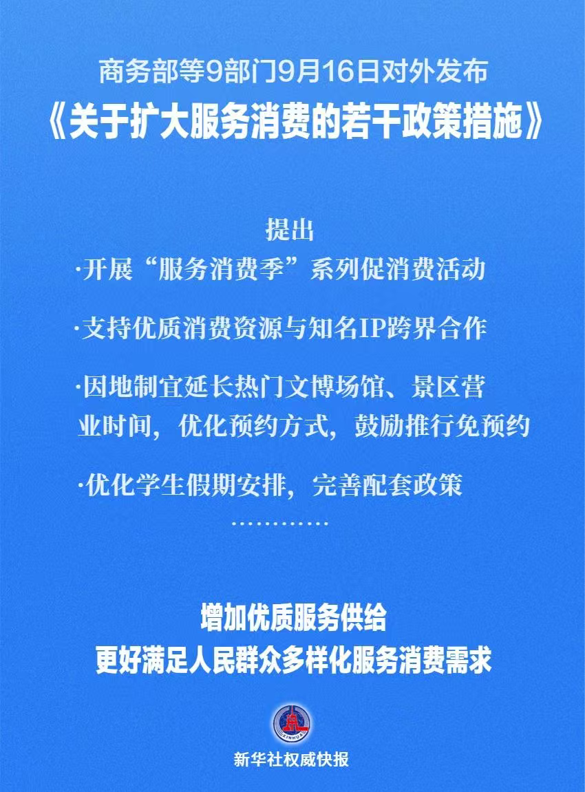 商务部等9部门9月16日对外发布《关于扩大服务消费的若干政策措施》提出五方面19条举措,包括开展“服务消费季”系列促消费活动、支持优质消费资源与知名IP跨界合作、因地制宜延长热门文博场馆、景区营业时间,优化预约方式,鼓励推行免预约、优化学生假期安排,完善配套政策等,增加优质服务供给,更好满足人民群众多样化服务消费需求。