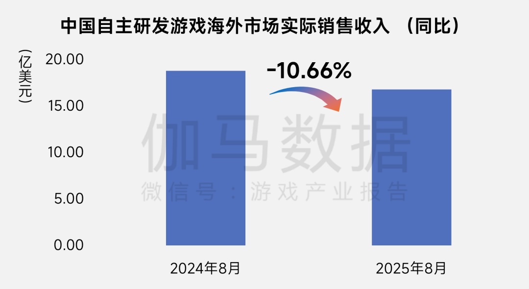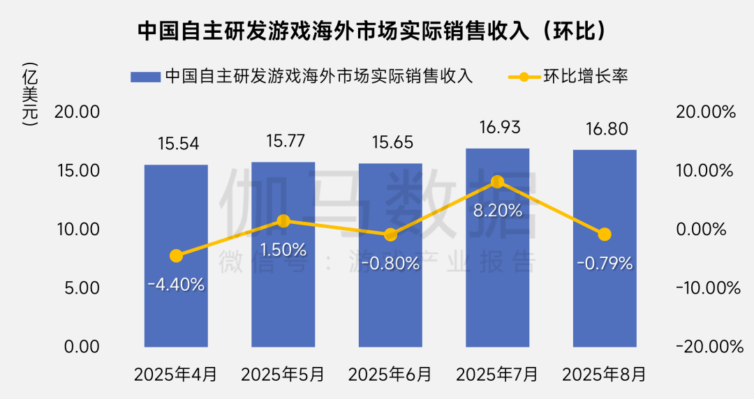 2025年8月,中国自主研发游戏海外市场实际销售收入为16.8亿美元,环比下降0.79%,同比下降10.66%。由于上月大量头部产品集中推出运营活动,带来高基数效应,本月收入出现回落。