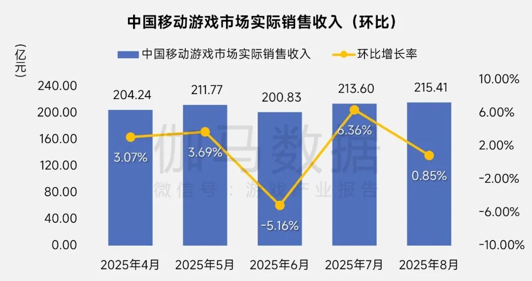 2025年8月,中国移动游戏市场收入为215.41亿元,环比增长0.85%,同比下降4.25%。《无畏契约:源能行动》《我的花园世界》等当月新品共计带动市场新增超2亿元流水。2025年8月,中国自主研发游戏海外市场实际销售收入为16.8亿美元,环比下降0.79%,同比下降10.66%。