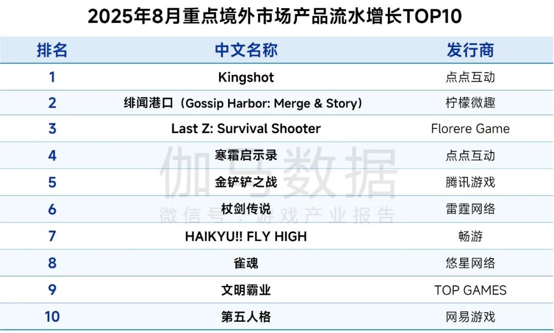 2025年8月重点境外市场产品流水增长TOP10中,点点互动旗下《Kingshot》《寒霜启示录》进入TOP5。依托成熟的研运能力,《Kingshot》本月流水环比增长超20%,其国内版本预计年内上线,有望进一步拓展收入空间。