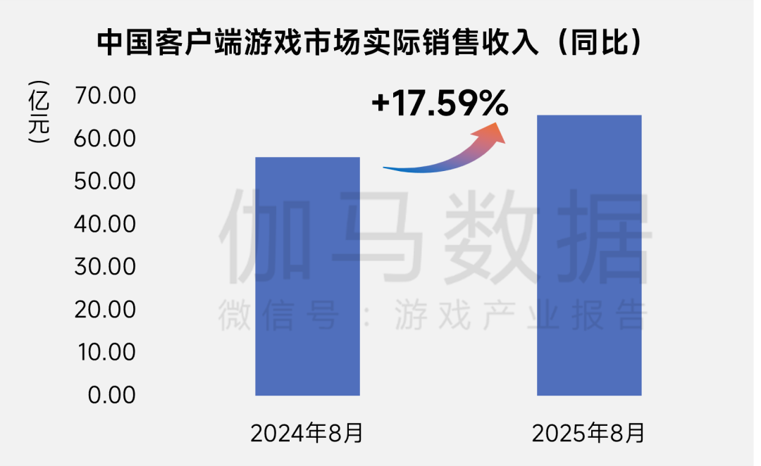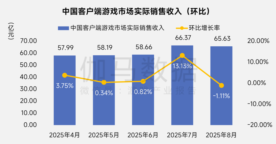 智通财经APP获悉,伽马数据发布了《2025年8月中国游戏产业月度报告(完整版)》。数据显示,2025年8月,中国国内游戏市场收入为292.63亿元,环比增长0.61%,同比下降13.01% 。2025年8月,中国客户端游戏市场收入为65.63亿元,环比下降1.11%,同比增长17.59%。本月客户端游戏市场同比增长主要由双端互通次新产品带来。