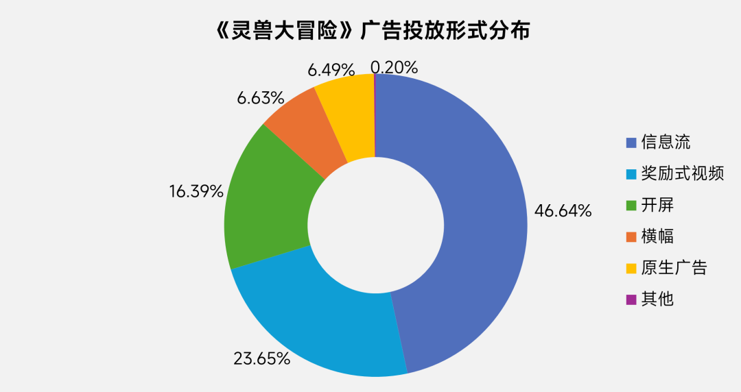 《灵兽大冒险》于8月7日上线,游戏广告投放集中于正式上线当天及上线前一天,上线后第二天起连续多日进入App Store游戏畅销榜TOP30,之后多数时间稳定在TOP60以内。从广告投放形式来看,《灵兽大冒险》广告投放以信息流广告为主,这一形式占统计日期内广告投放量的46.64%,其次是奖励式视频形式,占比为23.65%。