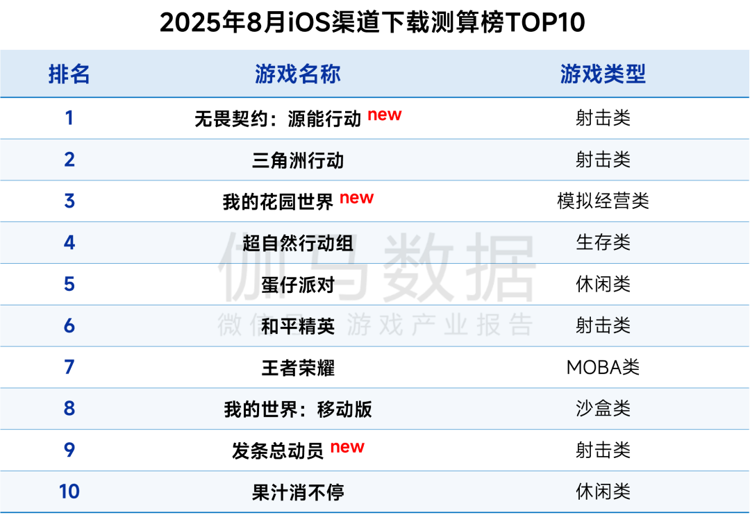 2025年8月,伽马数据iOS渠道下载测算榜TOP10中,射击类新品《无畏契约:源能行动》位列榜首,射击类产品整体占比达40%,显示出显著优势。同时,《我的花园世界》《发条总动员》两款新品也跻身榜单。