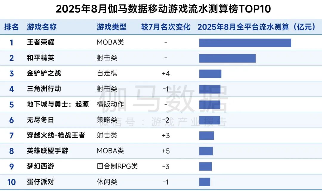 2025年8月,伽马数据移动游戏流水测算榜TOP10产品整体排名变动幅度均未超过5位,头部市场格局相对稳定。其中,《英雄联盟手游》和《金铲铲之战》成为排名提升幅度最大的两款产品。