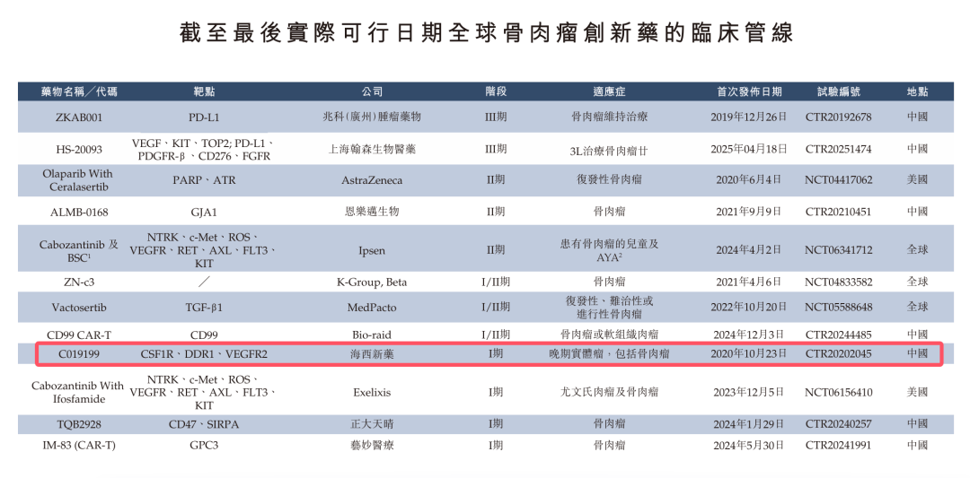目前,骨肉瘤的标准治疗方法主要以手术切除、化疗及放疗等传统方法为主。然而,对于复发、转移及难治性骨肉瘤患者,除了化疗之外,并不存在其他治疗方案。公司表示,C019199预计将成为填补二线及晚期骨肉瘤治疗空白的同类首款疗法。