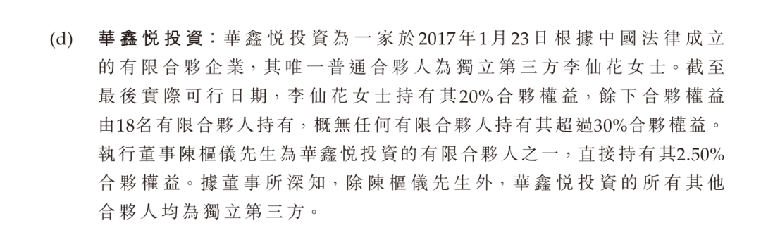 天眼查显示,华鑫悦投资于2017年1月成立,其唯一普通合伙人为李仙花,持有20%合伙权益,余下股份由尚晓丽、涂师红等18名合伙人持股。公司执行董事陈枢仪也是华鑫悦投资的有限合伙人之一。
