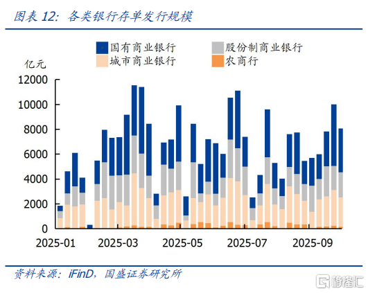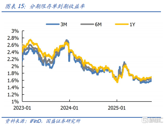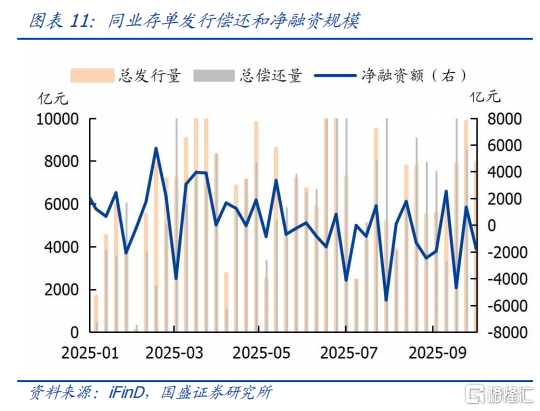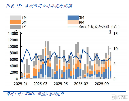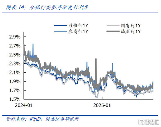 存单净融资回落,平均发行期限略有拉长。本周存单净融资-1773.4亿元(前值1344亿元),国有行、股份行、城商行、农商行1年存单发行利率分别收于1.71%、1.69%、1.75%、1.81%,较前值分别+3.0bp、+1.29bp、-0.86bp、+5.31bp。发行结构来看,本周加权平均发行期限7.0M(前值6.4M),3M存单发行1997.20亿元,6M期限发行1700.9亿元,1Y期限发行2244.6亿元。